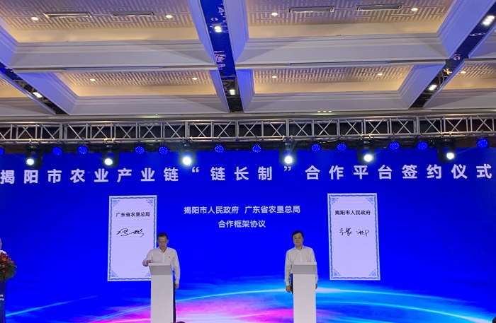 5月27日,揭陽(yáng)市人民政府舉行揭陽(yáng)市農(nóng)業(yè)產(chǎn)業(yè)鏈“鏈長(zhǎng)制”合作平臺(tái)簽約儀式。省農(nóng)墾集團(tuán)公司(省農(nóng)墾總局)黨委副書(shū)記、董事、總經(jīng)理(副局長(zhǎng))馮彤出席活動(dòng)。